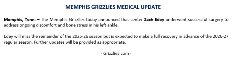 如今灰熊官方宣布,伊迪已经成功脚踝手术,将缺席本赛季剩余比赛,也是宣告提前赛季报销。不过伊迪预计能够在下赛季常规赛开始之前,完全康复回归球队出战。